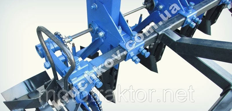 Шаг посадки можно изменять – 110 мм, 125 мм или 140 мм, в зависимости от условий выращивания и сорта чеснока. Регулировка происходит просто из-за изменения передаточного числа в цепном редукторе. Для поддержания нужного натяжения цепи конструкцией предусмотрен специальный натяжитель, что повышает надежность и долговечность механизма.