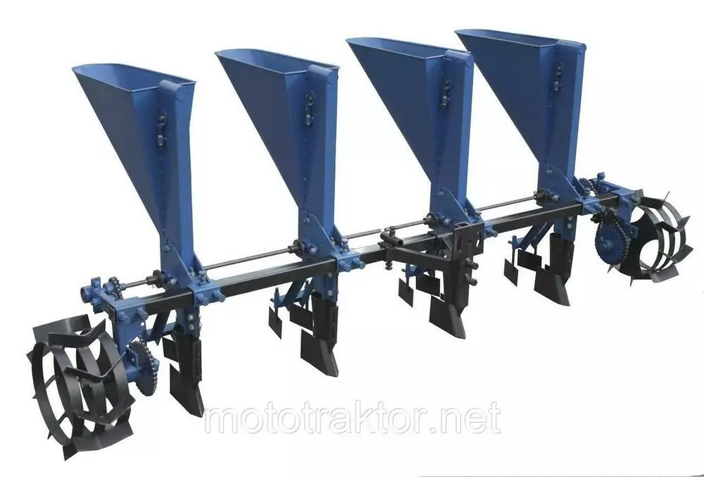 Агрегат обеспечивает посадку чеснока в 4 ряда с ровными междурядьями и стабильной глубиной заделки. Для работы необходимо использовать откалиброванные зубки чеснока размером 15–25 мм – это гарантирует точную дозировку и равномерное распределение посадочного материала. Почва перед посадкой должна быть предварительно подготовлена (взрыхлена и выровнена).