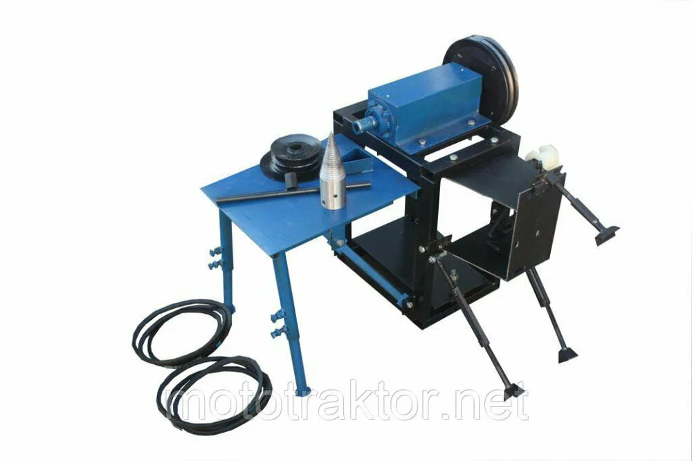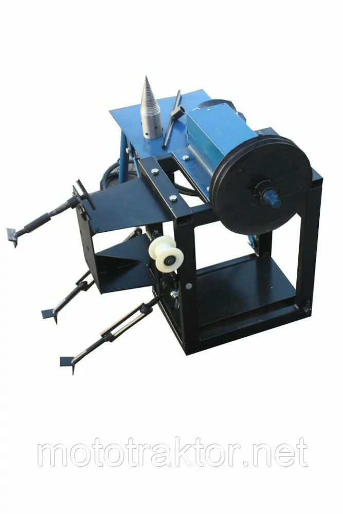 Данный дровокол агратируется с мототрактором. Привод осуществляется через ременную передачу.