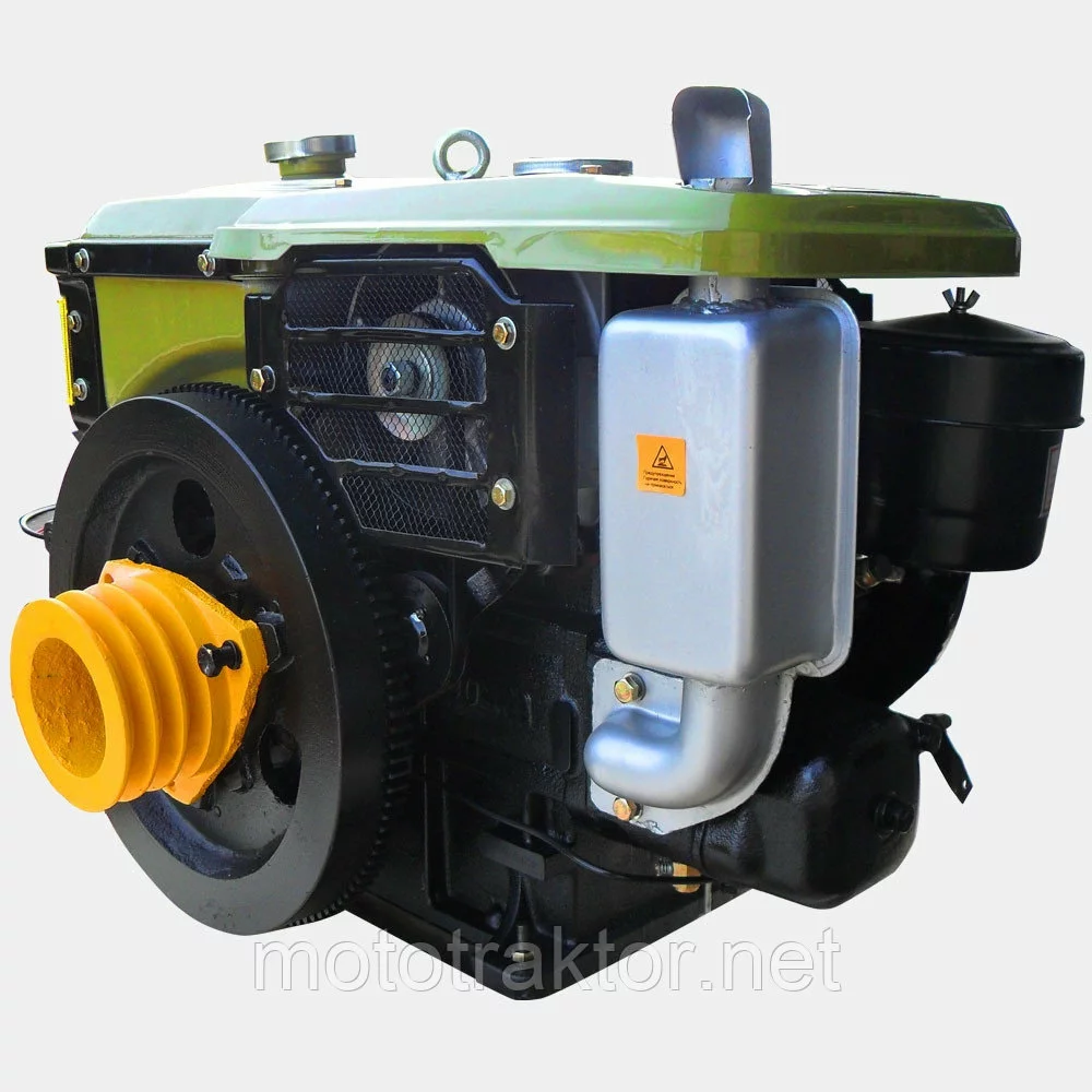 Двигатель ДД195ВЭ 12л.с.(электростартер)Дизельные двигатели «Кентавр» серии ДД относятся к одноцилиндровым двигателям средней мощности с горизонтальным расположением цилиндра, поперечным расположением коленвала и циркуляционным водяным охлаждением. Горизонтальное расположение цилиндра позволило компактно скомпоновать двигатель с радиатором системы охлаждения, емким топливным баком, эффективным воздушным фильтром и глушителем. На всех двигателях этой серии установлен массивный маховик, значительно увеличивающий плавность работы двигателя. На некоторых моделях имеется электростартер и фара. Подключение полезной нагрузки осуществляется с помощью многоручьевой клиноременной передачи.