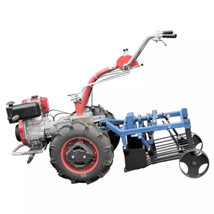 Активный нож шириной 382 мм и толщиной 5 мм имеет остроконечную кромку, что позволяет точно подрезать слой грунта. Грохот состоит из 15 стальных прутков по 500 мм длиной и 10 мм толщиной – он эффективно отделяет клубни от земли.