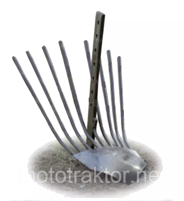 В задней части картофелекопателя расположены восемь крепких зубцов из стального прута Ø10 мм. Они качественно разрыхляют землю и способствуют отделению клубней картофеля от почвы. Общая длина копалки – 500 мм, максимальная ширина – 350 мм.