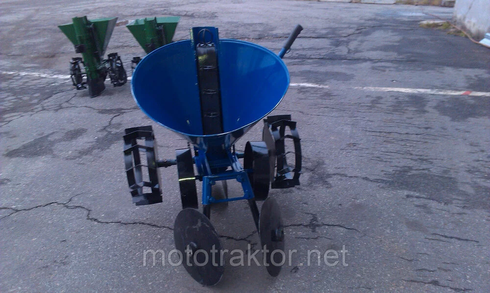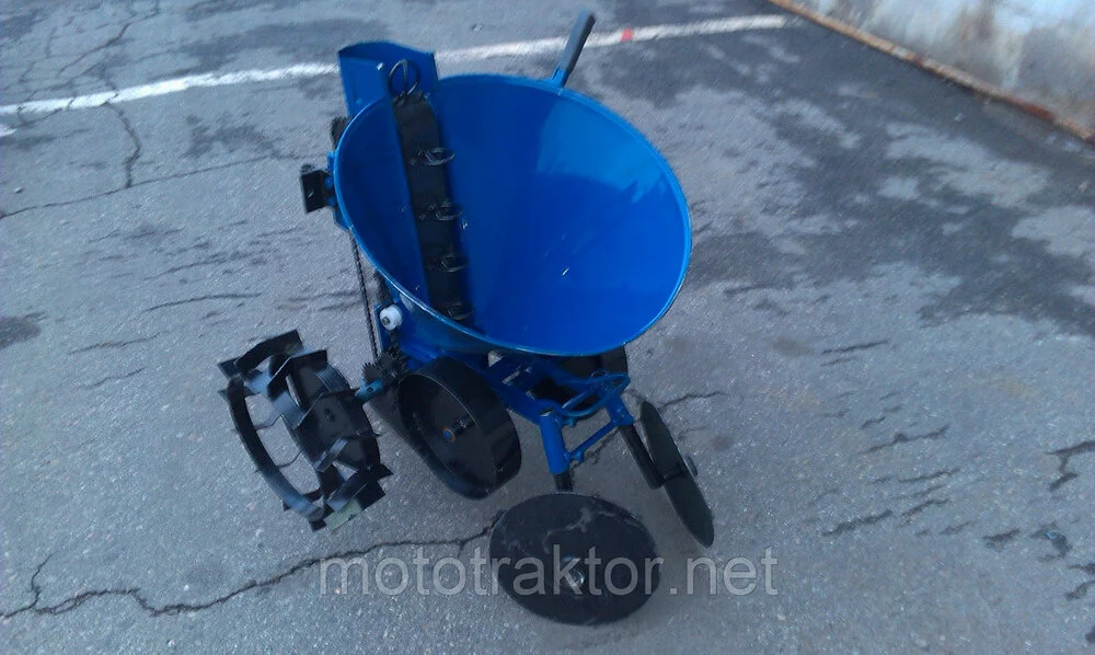 Картофеле Сажатель Мотоблочный — 1 ряд, транспортер Ленточного типа, сажалка синего цвета с транспортировочными колесами.