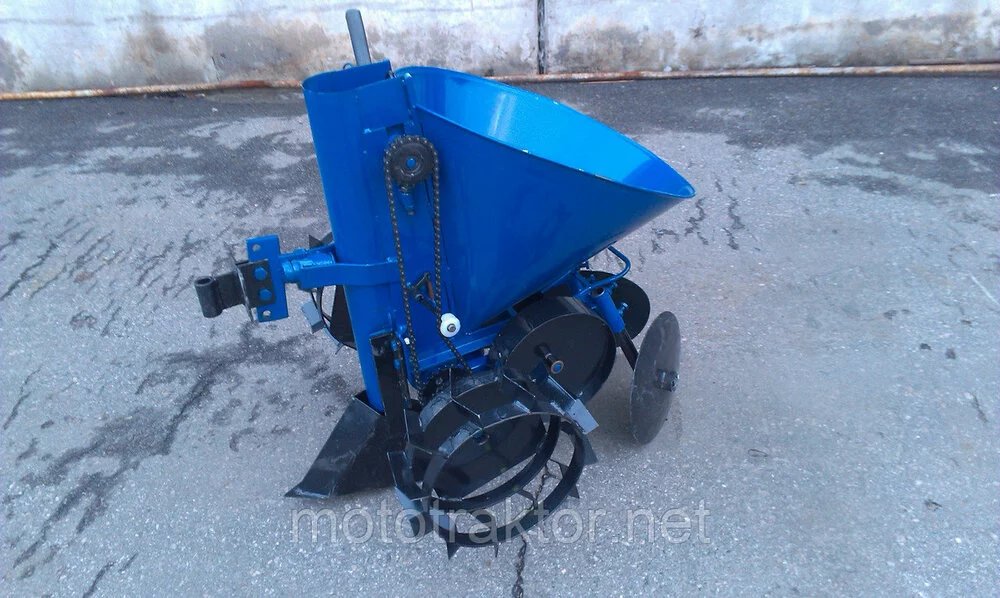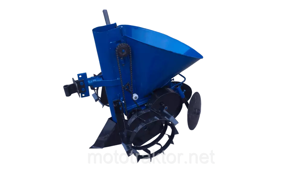 В комплект поставки входит универсальное сцепное устройство для агрегатирования картофелесажалки к любому мотоблоку без дополнительной сцепки.