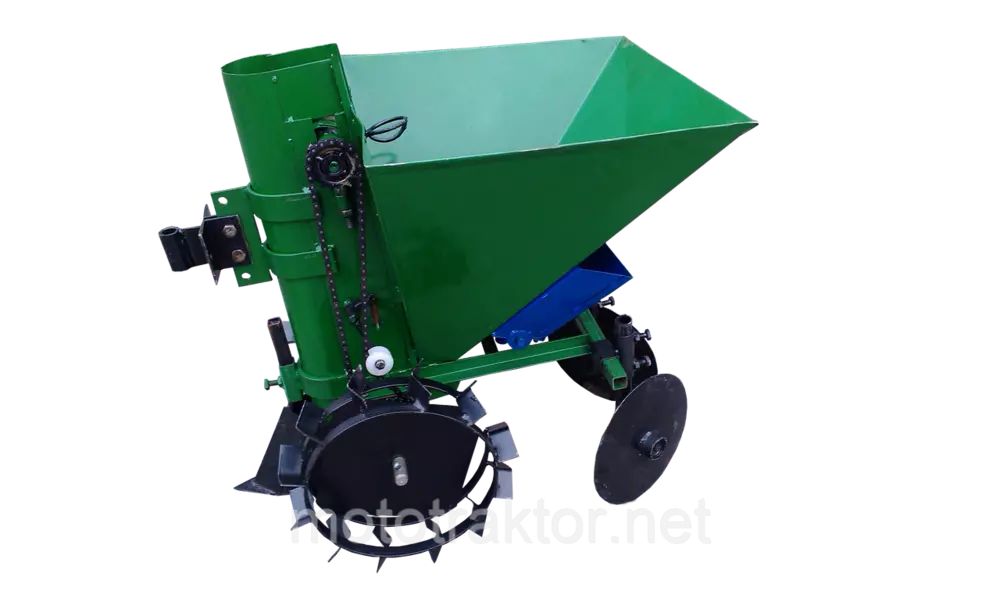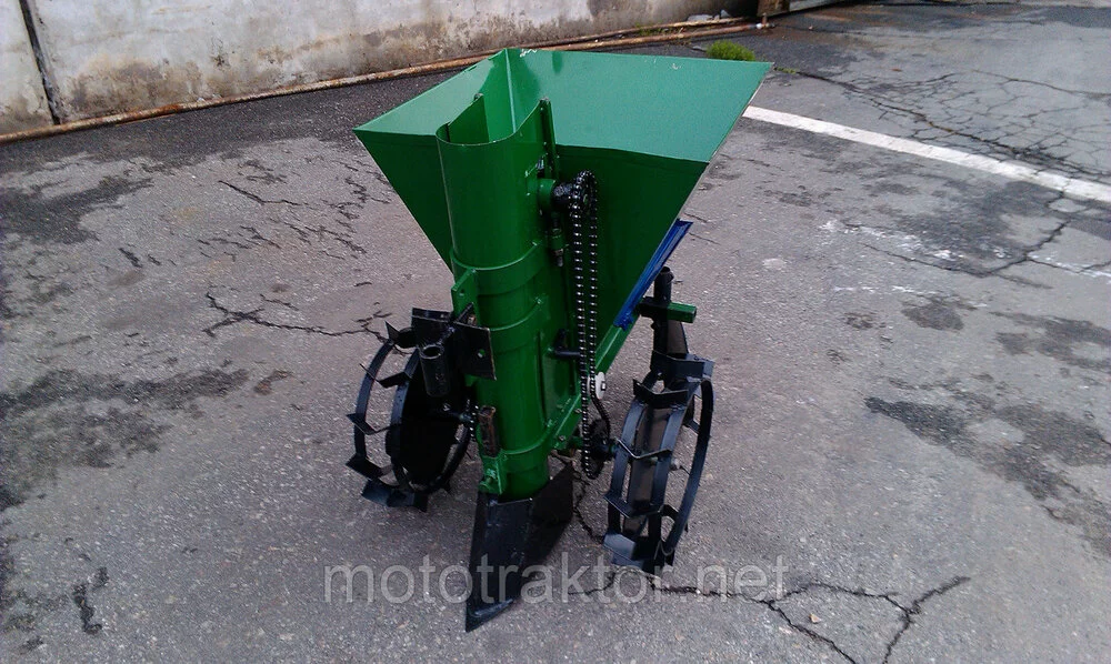 Картофеле Сажатель Мотоблочный — 1 ряд, транспортер Цепного типа, с бункером для Удобрений, сажалка зеленого цвета.