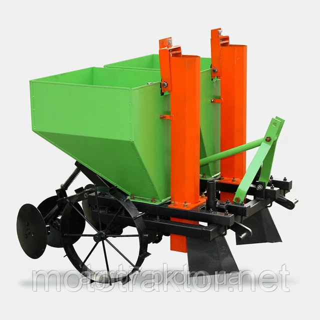 Новый современный двухрядный картофелесажатель предназначен для механизированного комфортного высаживания картофеля с помощью небольшого трактора. Навешивается на трехточечный навесной механизм сзади трактора. Разработан с учетом пожеланий и предложений украинских аграриев, профессионально выращивающих картофель: