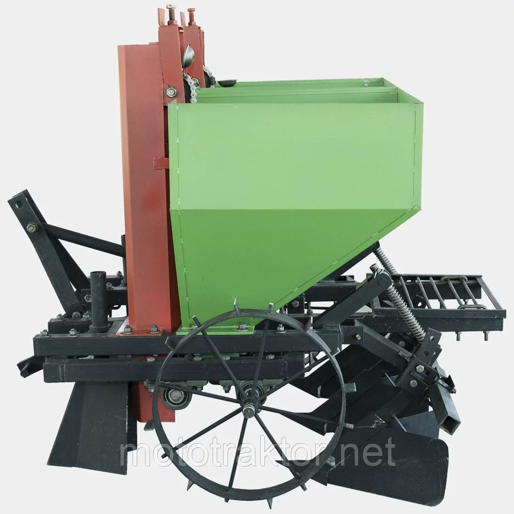 Высадка производится в заранее подготовленную почву. Бункер для клубней - металлический сварной. Борозда формируется клиновым сошником с регулируемым заглублением. Привод от опорных колес с почвозацепами на элеватор осуществляется цепной передачей. При дополнительной установке туковысевающего аппарата одновременно с высадкой клубней выполняет дозированное внесение в почву гранулированных минеральных удобрений через трубу клинового сошника.