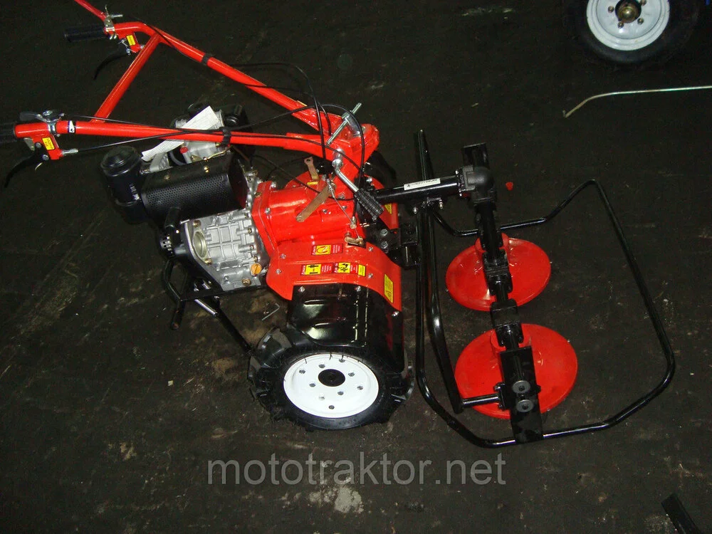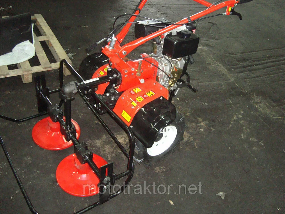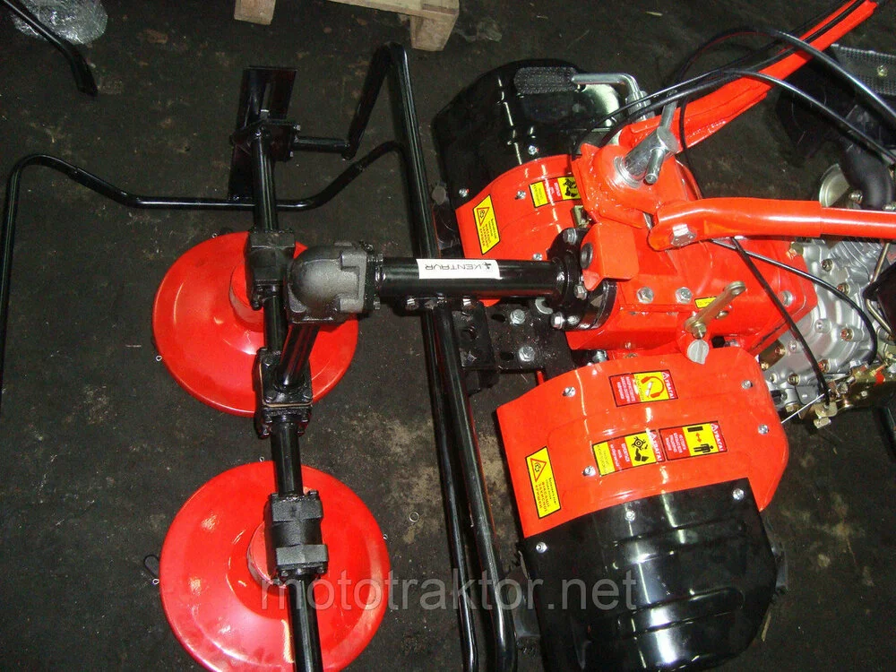 Активная роторная косилка для мотоблоков воздушного охлаждения с валом отбора мощности - роторная сенокосилка функционирует путем разворота руля мотоблока на 180 градусов, и включения заднего хода.