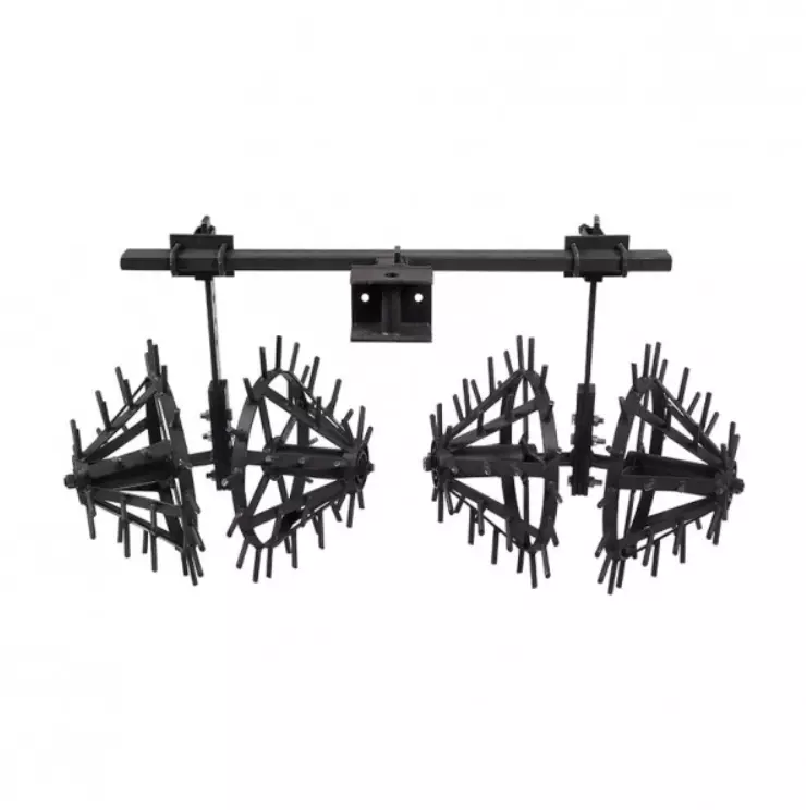 Комплект состоит из рамы и двух рабочих секций. Каждая секция имеет стойку из стальной полосы 50×10×500мм и два конусных роторных рабочих органа с приваренными шипами. Диаметр оси – 22мм, шипа – 10мм. Для плавности вращения использованы подшипники 204.