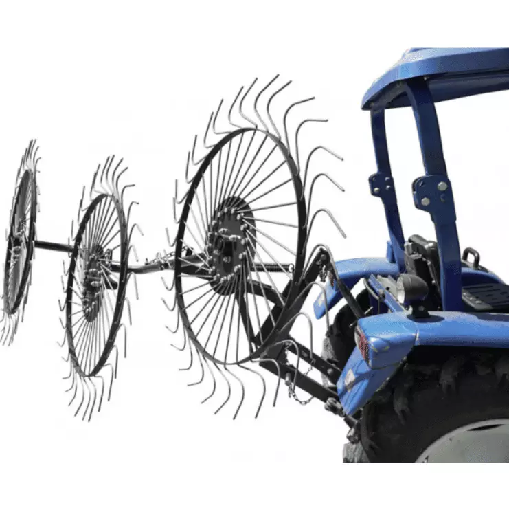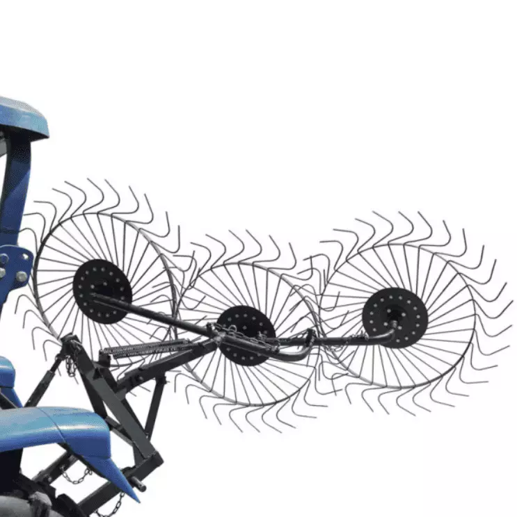 Грабли легко присоединяются к мототракторам или минитракторам с трехточечным креплением. Конструкция на основе трех рабочих секций (лучей) позволяет обрабатывать полосу шириной до 1.8 м. Это значительно повышает производительность работы в поле и уменьшает расход топлива и времени. Грабли работают деликатно, не повреждая покрова или стеблей, сохраняя качество сена на высоком уровне.