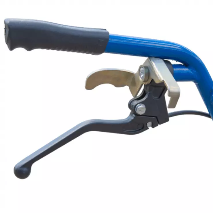 В основе конструкции надежная рама, к которой крепится редуктор, двигатель (не входит в комплект) и кронштейн с опорным колесом. Передача крутящего момента организована в два этапа: