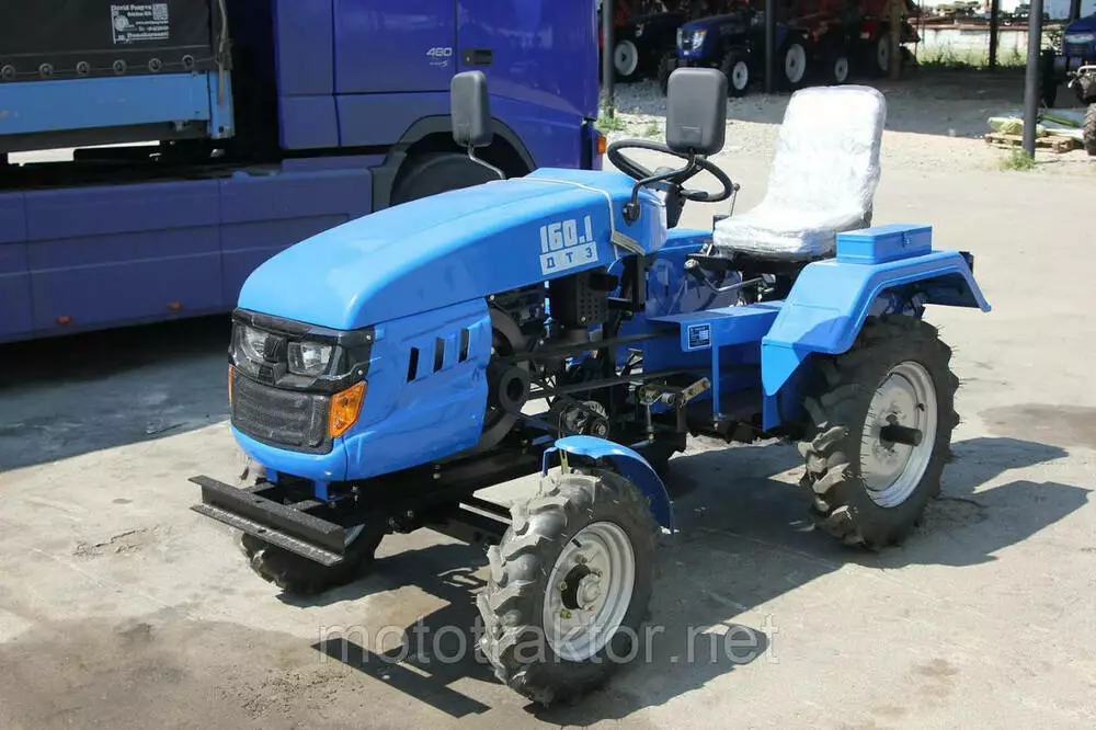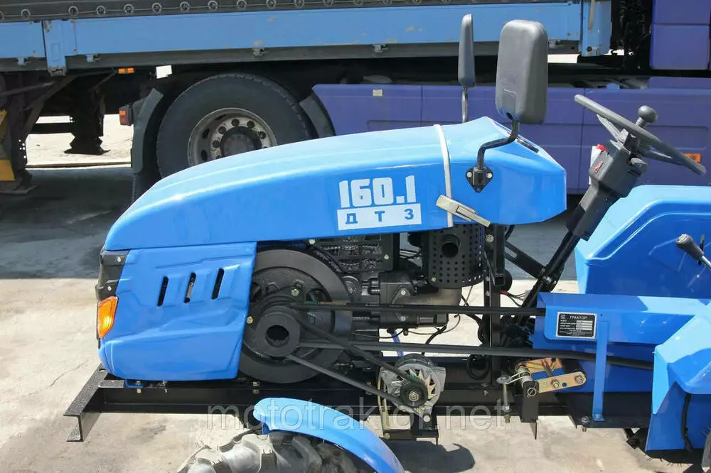 Полностью доработанная модель мототрактора ДТЗ 160.1 оснащена барабанной системой тормозов, комфортным в работе рулем. Широкая колесная база м возможностью регулировки колеи и мягкое сидение обеспечивают удобство фермеру. Привод ременного типа. Чтобы выполнять работу ночью, минитрактрактор оснащен галогенной фарой, габаритными огнями.