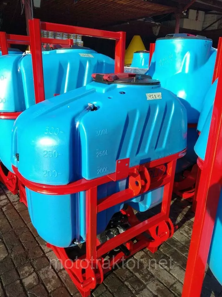 Резервуар для раствора, установленный в закрытую раму с раскидными штангами, удерживающие армированные шланги, с подсоединенными форсунками, идущие от распределителя с высокоточным глицериновым манометром. Подача жидкостей происходит за счет насоса, приводящегося в работу от вала отбора мощности. Имеет четырехступенчатую систему фильтрации. Агрегатируются с тракторами от 15 до 50 л.с., в зависимости от объема бака.