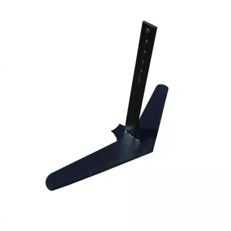 Для повышения надежности конструкции в нижней части стойки приварен квадрат 4×80×80 мм, обеспечивающий дополнительную жесткость во время работы. А спереди закреплен металлический уголок размером 4×30×100 мм, что придает устойчивости и защите от деформаций при контакте с твердым грунтом или камнями.