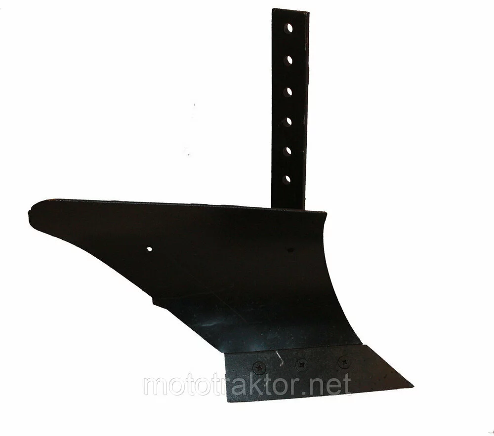 Стойкая плуга имеет размер 10×50×500 мм и оборудована регулировочными отверстиями, которые позволяют адаптировать угол атаки и глубину вспашки под разные условия грунта. Отвал толщиной 3 мм (250×520 мм) эффективно переворачивает пласт земли, а полевая доска (8×40×420 мм) стабилизирует движение плуга, предотвращая его отклонение в сторону.