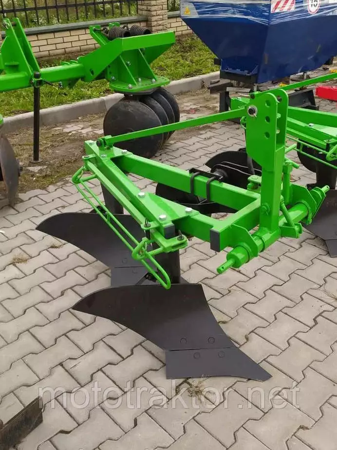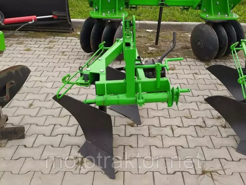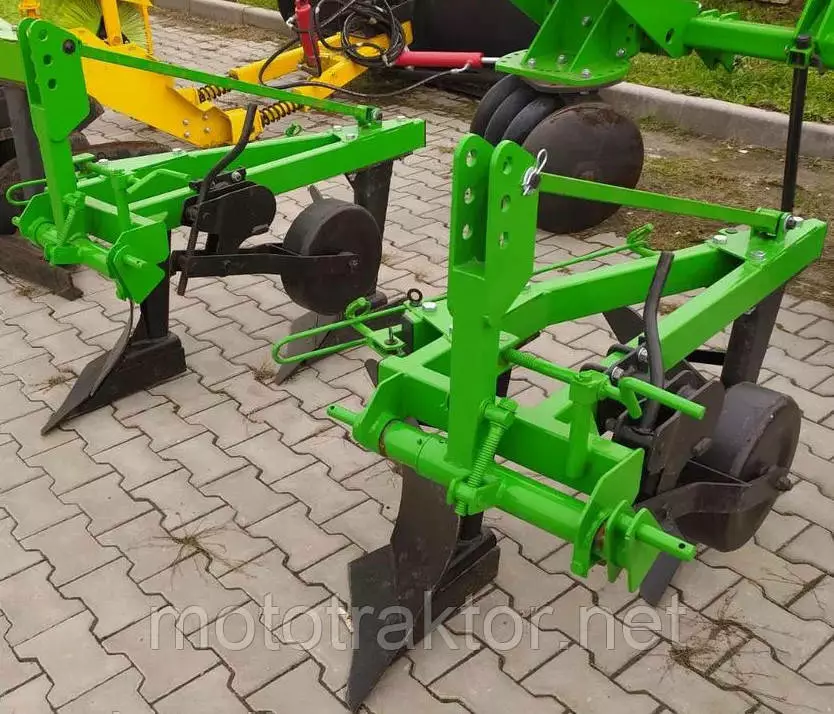 Трех точечная система навески плуга позволяет присоединить плуг к мини-трактору, оснащенный II или III категории заднего навесного устройства. Пeредок с системoй навески плуга снабжен двумя регулировочными винтами, которые дают возможность регулировки ширины первого отвала.