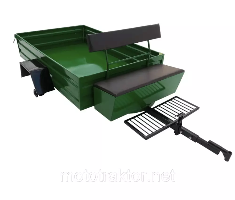 Прицеп для мотоблока ПМ-500Прицеп для мотоблока ПМ-500 изготовлен из усиленной рамы, надежной площадки, бортов выполненных с качественными ребрами жесткости. В комплекс прицепа входит грузовой отсек, предназначенный для перевозки различного груза, легкость погрузки обеспечивается невысокой базой прицепа и открытием бортов, отсек для водителя, укомплектован надежной подножкой, удобным сидением, под которым находится вместительный рундук для необходимых вещей, фиксирующей спинкой.