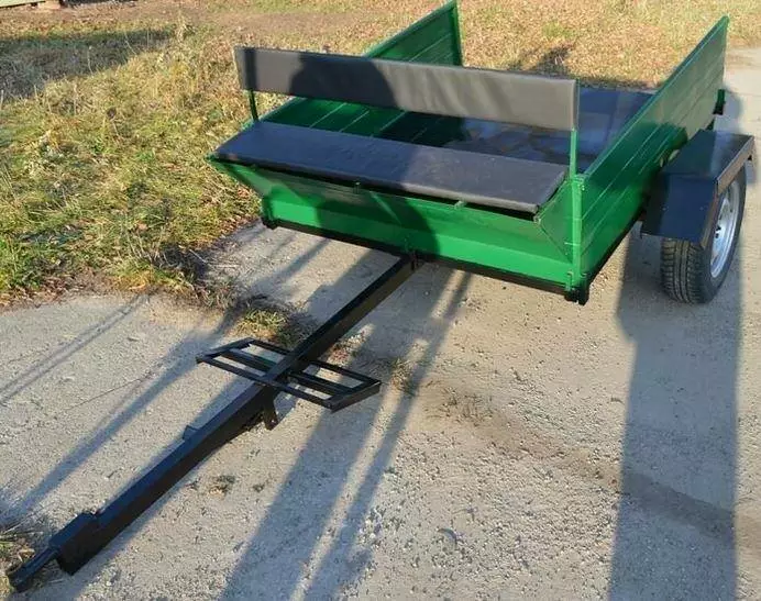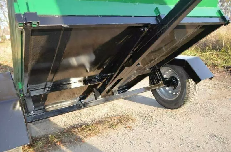 Бункер под инструменты, сидушка на два человека. Задний борт откидывающийся м на защелках. Все борта съемные. Усиленная сцепка. Ленточный тормоз.